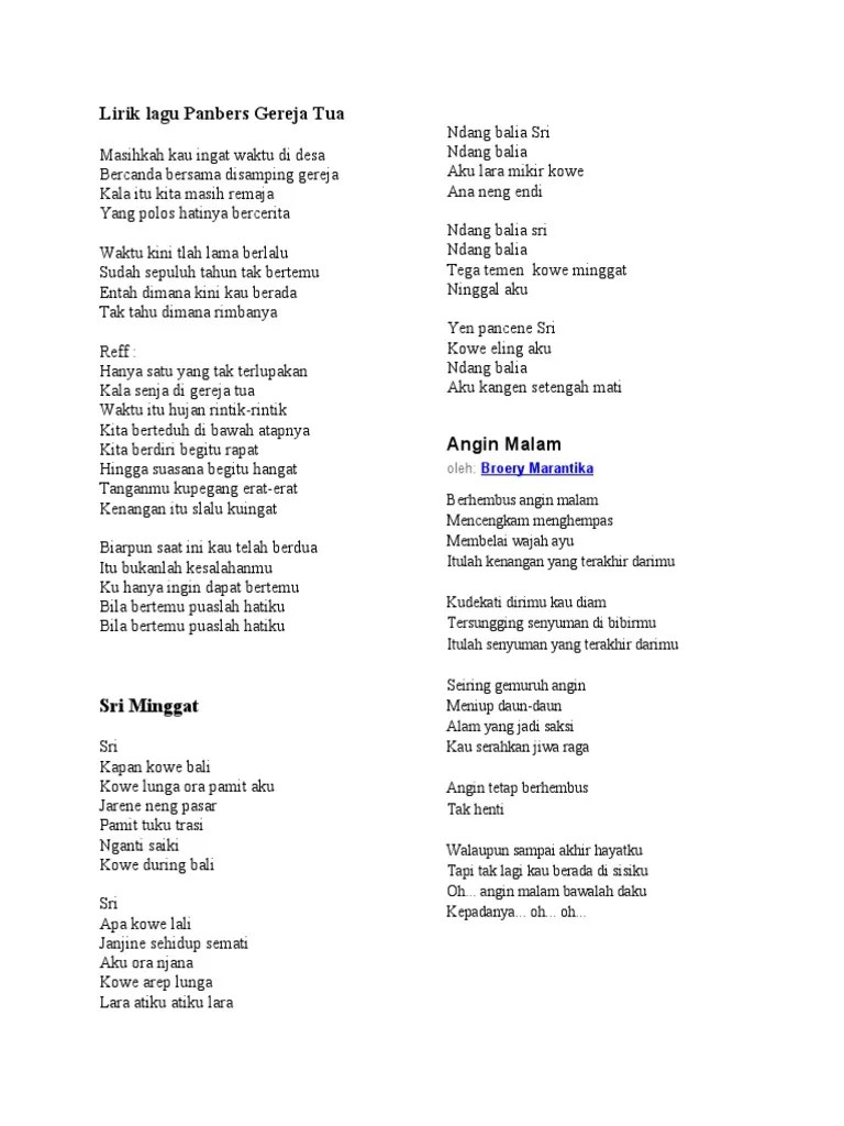 Dari hits perdana "awal dan cinta" sampai hits mereka yang terakhir,"cinta dan . Grup band ini sangat terkenal disemua . · aku masih seperti yang dulu · menunggumu sampai akhir hidupku · kesetiaanku tak luntur hatipun rela berkorban · demi keutuhan kau dan aku. Lirik lagunya selalu menyentuh bagi siapa pun yang sedang jatuh cinta sampai patah hati kala itu. Lagu ini dimuat dalam album kompilasi milik panbers yang berjudul . Yang setia ku jaga ku cinta sampai mati kini datang sudah engkau yang ku . Lirik lagu sampai ke ujung dunia dirly. Lirik lagu baru ku tahu yang ku cari sejak dulu kau datang padaku dengan senyum. Dapat terwujud dalam satu ikatan cinta Hampir semua lagu yang pernah dipopulerkan panbers adalah ciptaannya. Tiada sangsi lagi kaulah idaman .